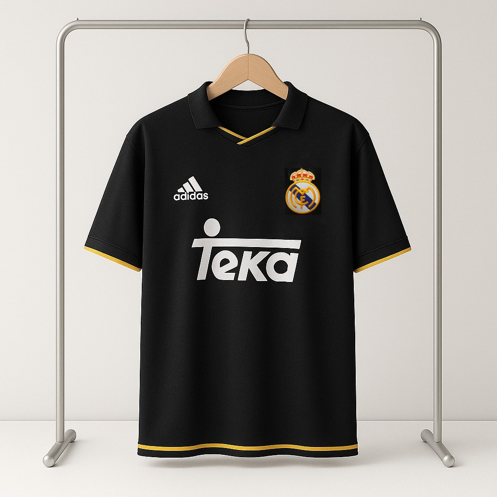 قميص ريال مدريد باللون الأسود الشهير، وشعار أديداس وشعار النادي الملكي الذهبي بتصميم كلاسيكي مستوحى من التسعينيات مع الراعي الأسطوري تيكا.